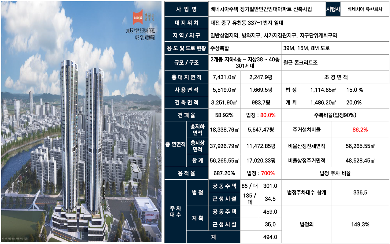 ■ 위치 : 대전 중구 유천동 337-1번지 일대■ 용도 : 주상복합 아파트■ 대지면적 : 7,431.0m2■ 건축면적 : 3,251.90m2